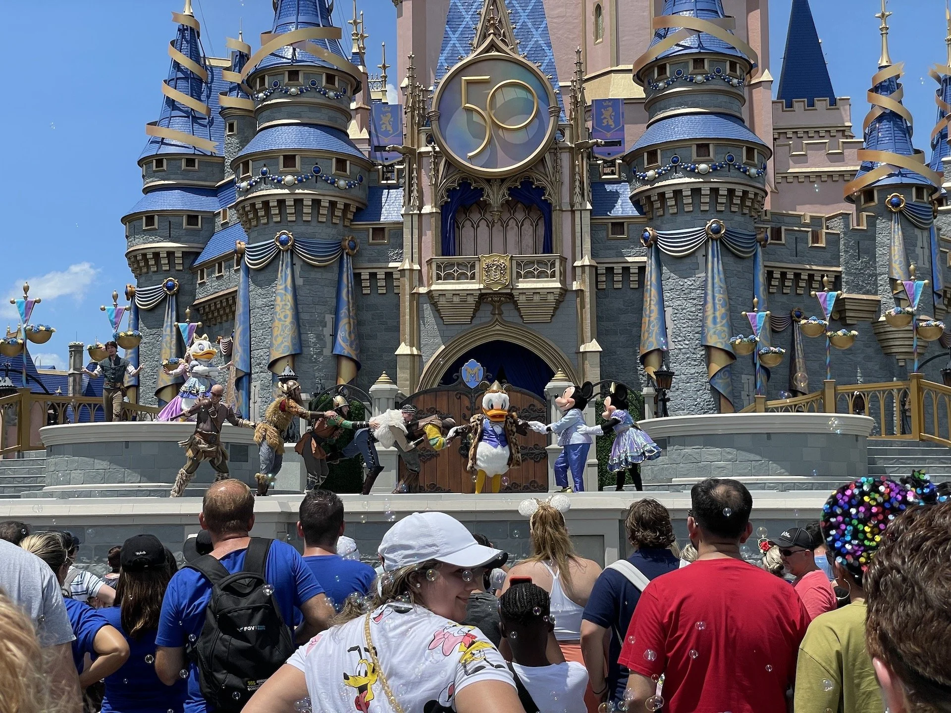 Let the Magic Begin is the daily welcome show on the castle stage. It plays five minutes before scheduled park open, which means if you have Early Entry you’ll probably be finishing up your first ride or two and need to hustle back to the hub if you want to watch it.