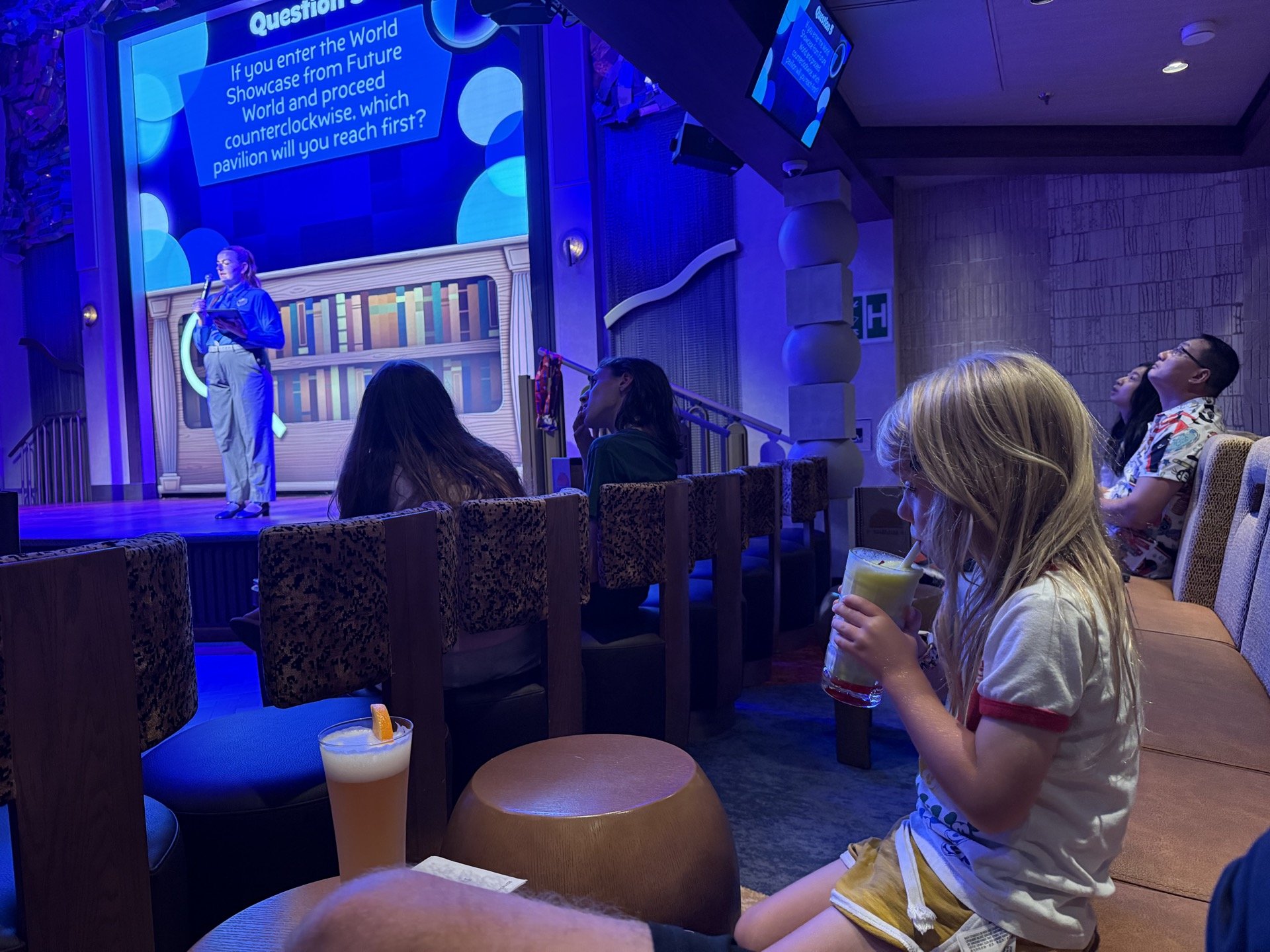 (I’m not surprised the randomly-timed above photo by Emily happened to be during this question about going counterclockwise around the World Showcase. The question spent a hefty amount of time on the screen while the room “debated” what direction that was. Wild.)