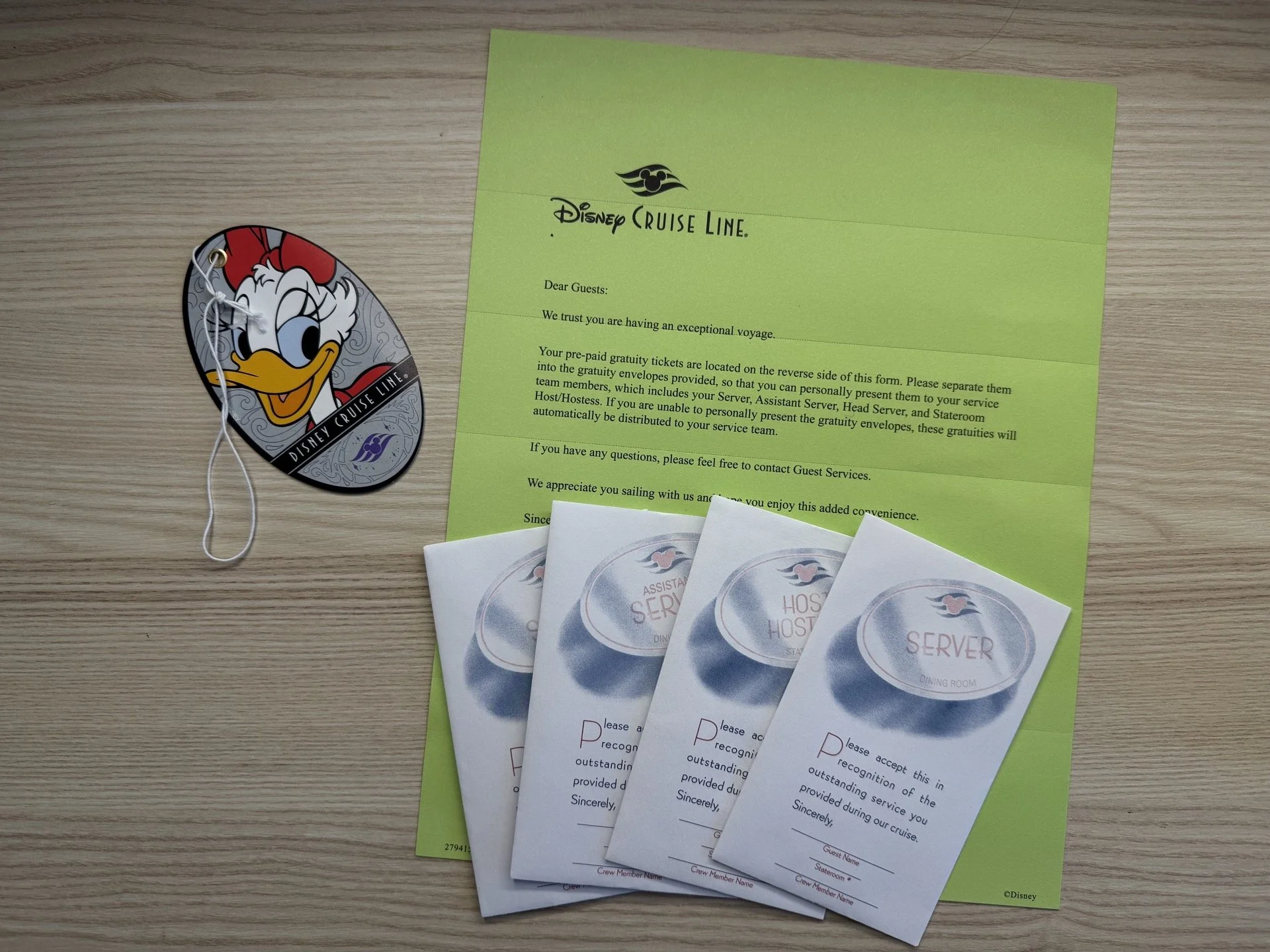 Gratuity envelopes are provided for Head Server, Server, Assistant Server, and Stateroom Host/ess. If you prepaid gratuities, you’ll get a sheet with tearable slips indicating the amount. You can place these in the envelopes and hand them to the Crew Members if you want.