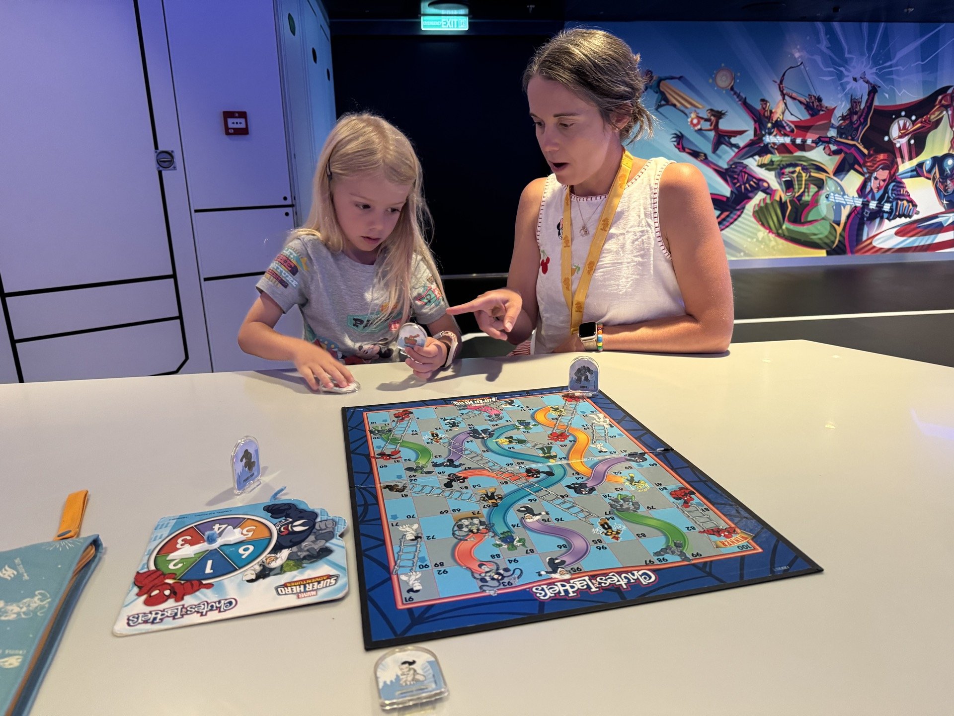 Once that was done, we spent some time in the Marvel Super Hero Academy playing Chutes and Ladders (a game I believe was engineered to tear our family apart) and then checking out the super hero suit design and interactive game.