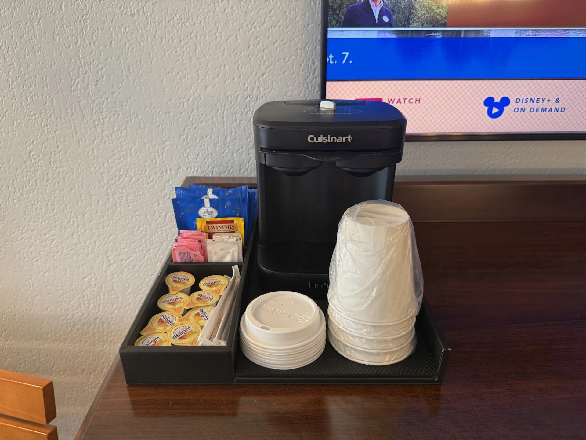 The room was nice and clean. The TV was large, and there was a good amount of desk space. There were multiple working outlets. Most notably compared to the value resorts, there was ample room for two people to get ready in the vanity area.