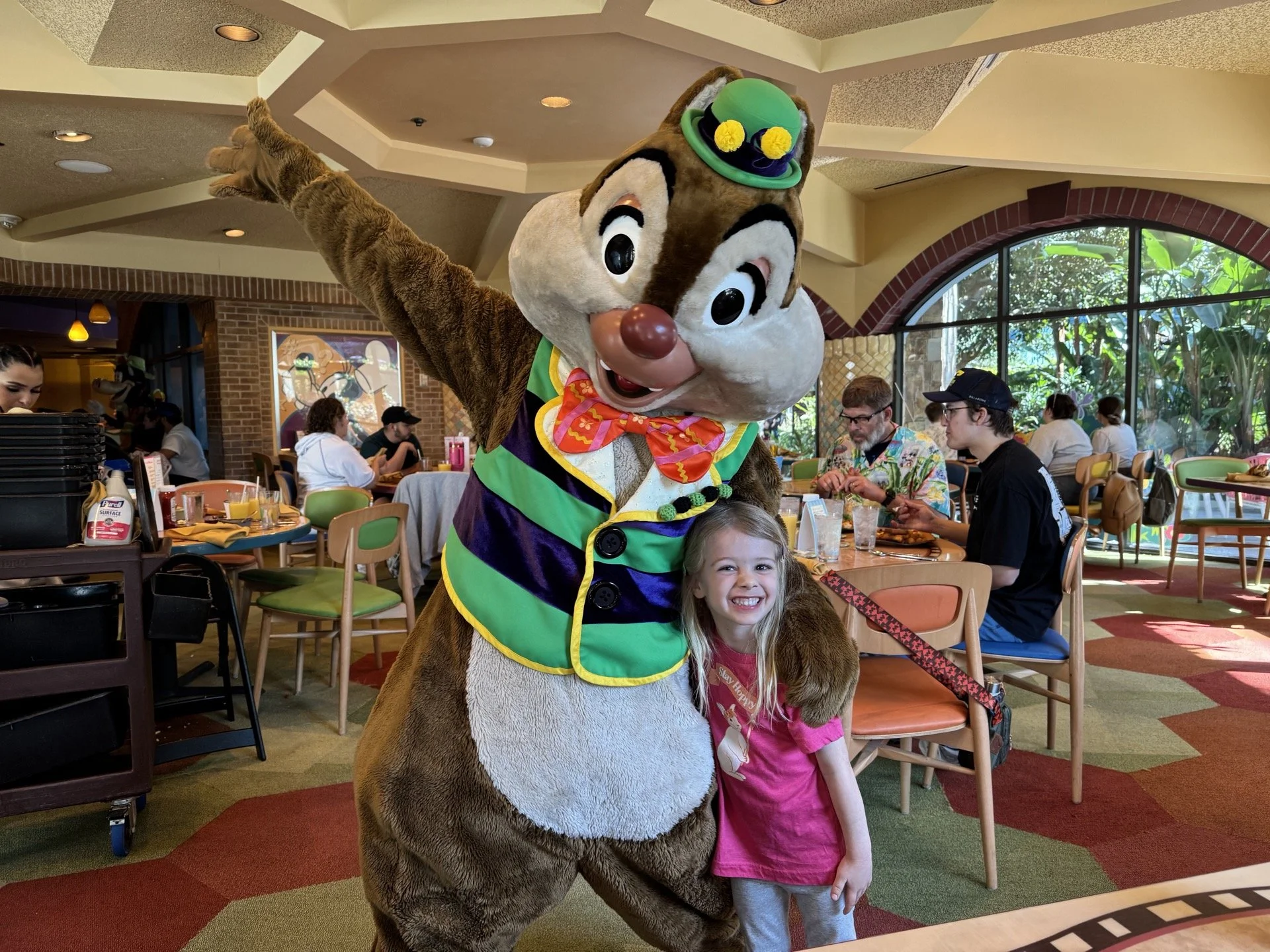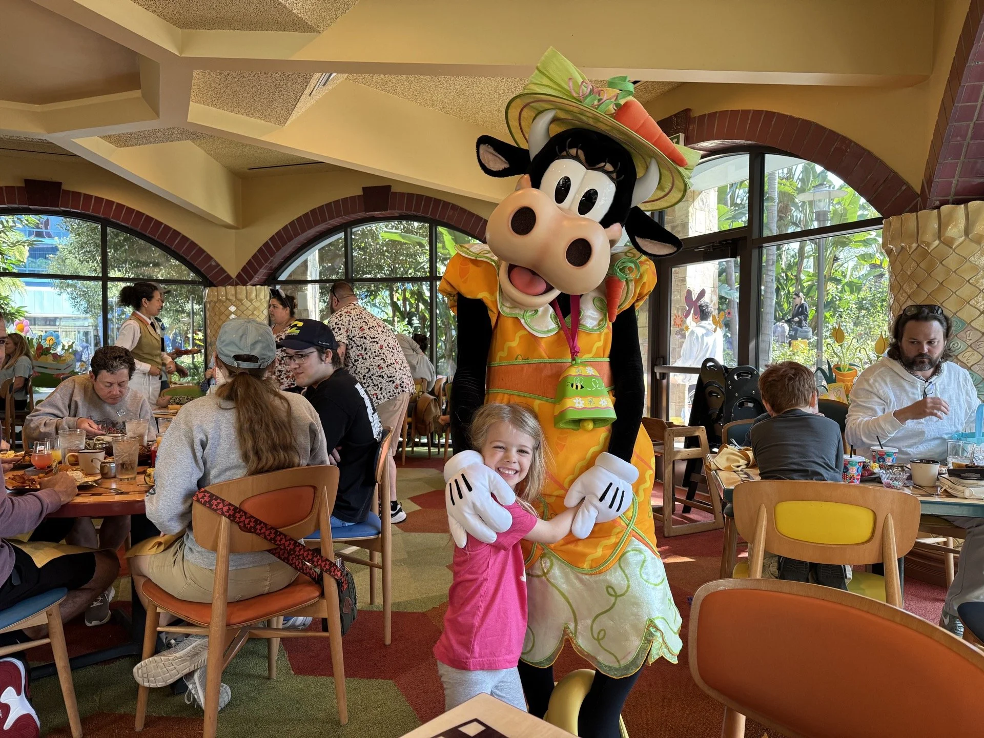 We had an 8:35AM reservation for Easter (characters were in their seasonal outfits, fyi). Leaving our Harbor Boulevard hotel at 7:55AM we were at the restaurant at 8:18AM. We had to pass through security and Downtown Disney to get there, but there were no delays and this is 10/10 the option I’d always go with (rather than driving or Ubering to the front of the hotel).