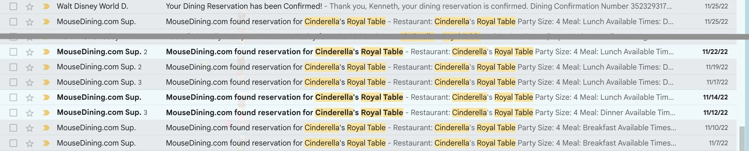 Now, on the one hand you might think “wow, that’s tough.” On the other hand, look at how well MouseDining did finding availability. I set the alert around November 7 for a December 9 search. Then it sent me 14 emails over the next 18 days—not a bad frequency for one of the most popular reservations at Walt Disney World.