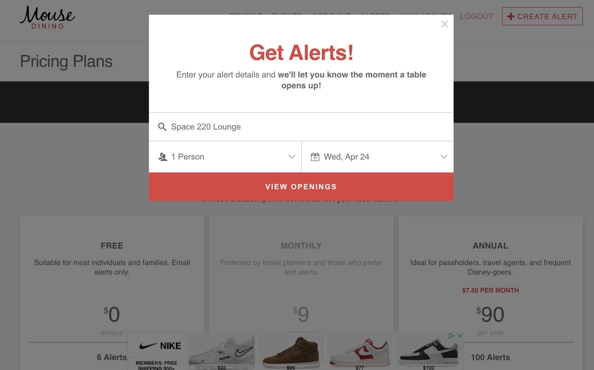 Signing up for MouseDining is easy enough. Just visit the homepage and click “Login” and “Sign Up.” At the top right corner of the site is a “+ CREATE ALERT” button that takes you to the very straightforward workflow for creating an alert.