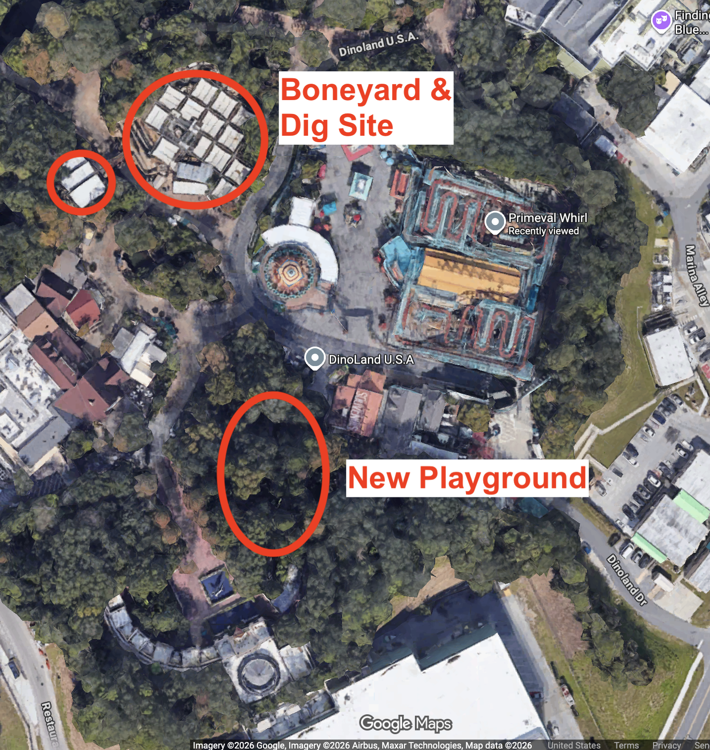 Dino-Rama is being replaced by the new E-Ticket Casita ride (discussed below), plus an unidentified structure, possibly a play area, but maybe even just queue space