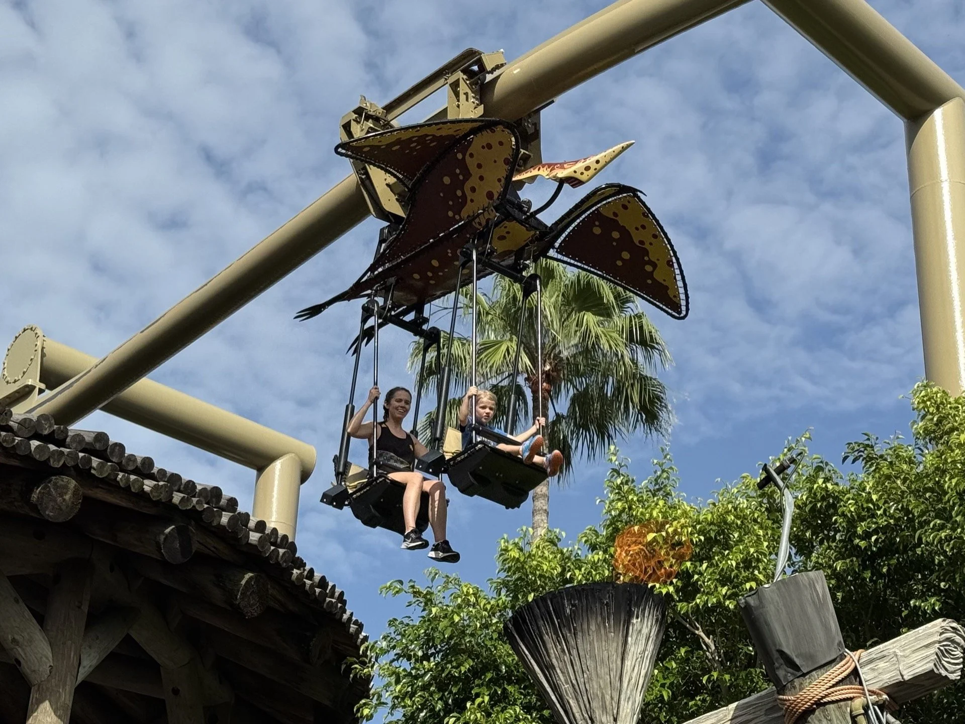 The first thing you have to understand about Pteranodon Flyers is its tricky height requirement. The ride has a height minimum of 36”, but maximum of 56”. There’s an exception to the maximum 56” if you’re riding with a child between 36” and 56”.