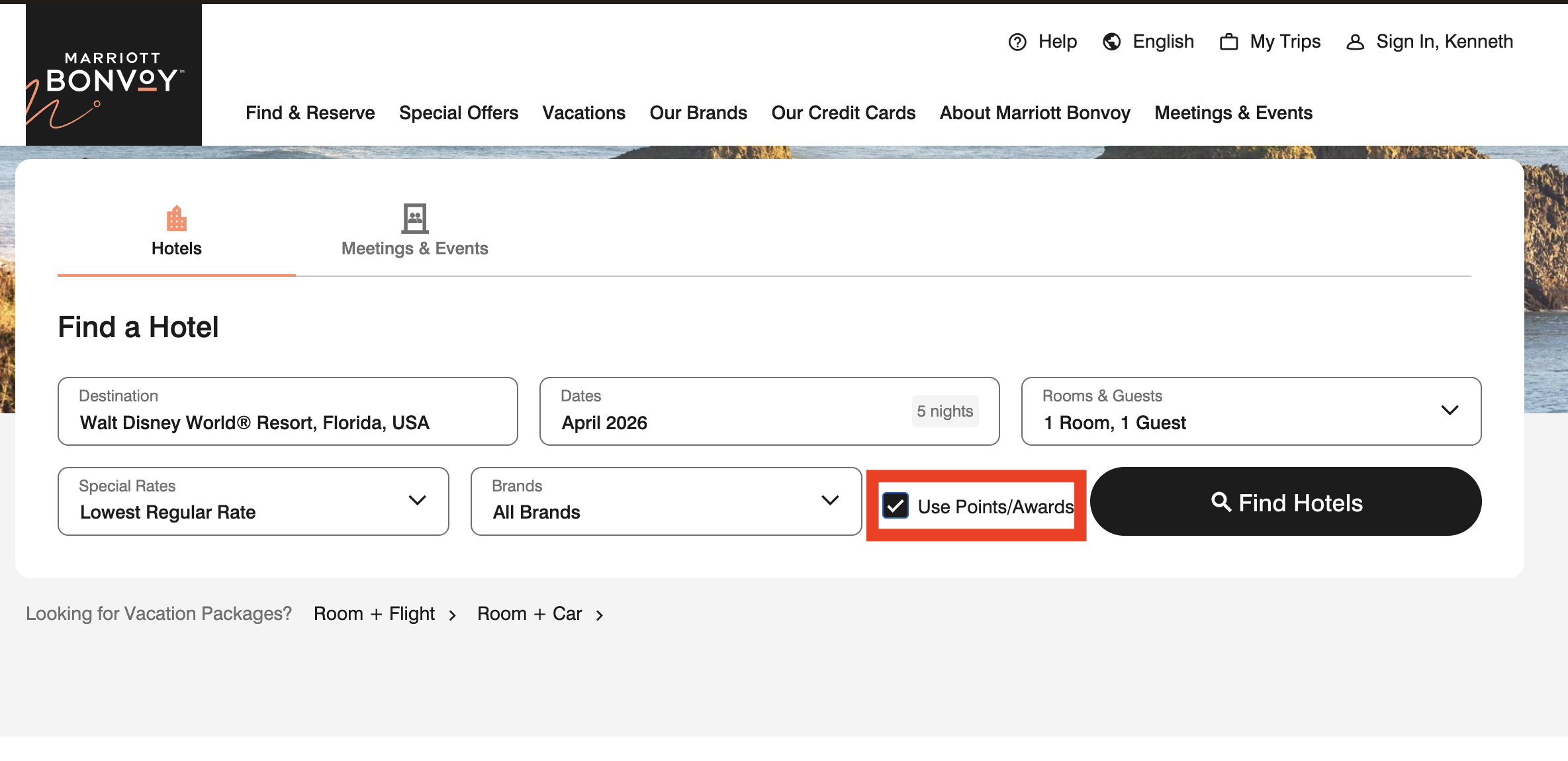 And I’ll check the box that says “Use Points / Awards” because I’m trying to book with points. Then I click “Find Hotels.”