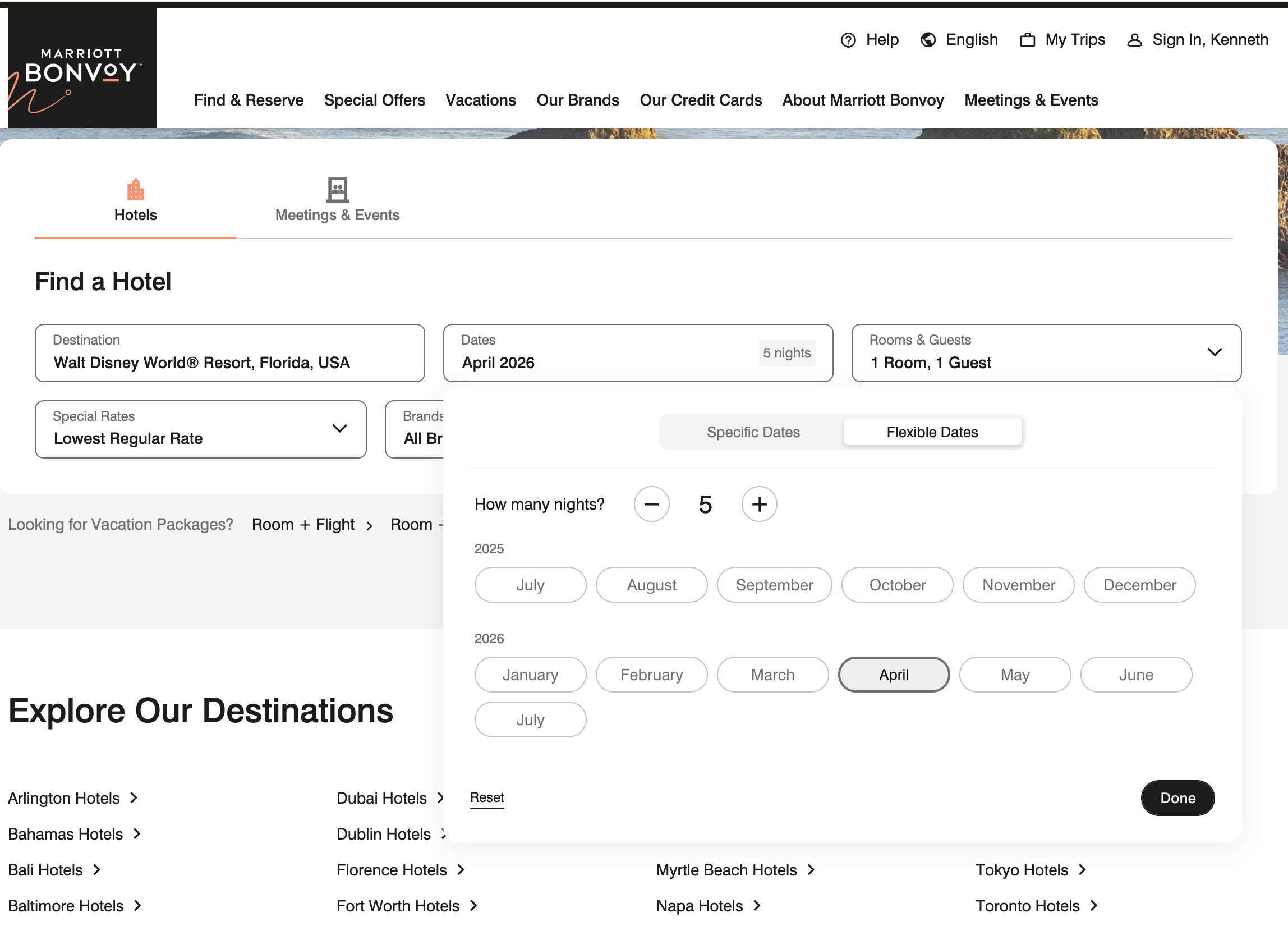 I’m going to use “Disney World” as my destination. I’m not searching for any special rates, I’ll just search for one adult in one room. There are two ways to search for dates. If you need specific dates, you can input them here. If those dates aren’t available, the results page will have a “Dates Flexible? View Availability” option. I’m going to just search for flexible dates right away by searching for five nights in April.