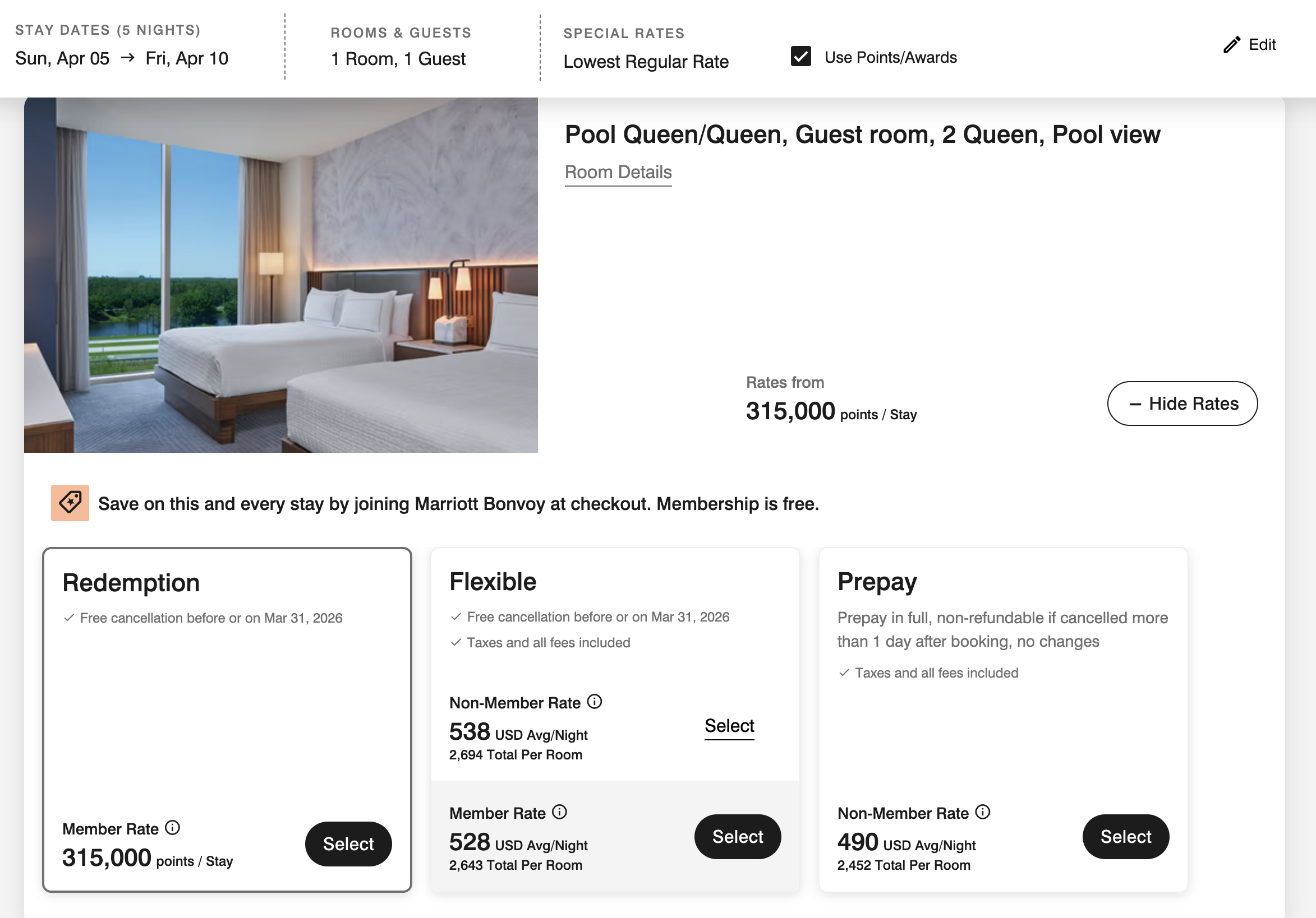 All these prices are displayed as total rates for my five night stay with the indicated check-in date. Availability in April isn’t great, but I could also look into other months using the arrows on this page. I’ll pick Sunday, April 5 check in for 315,000 points.