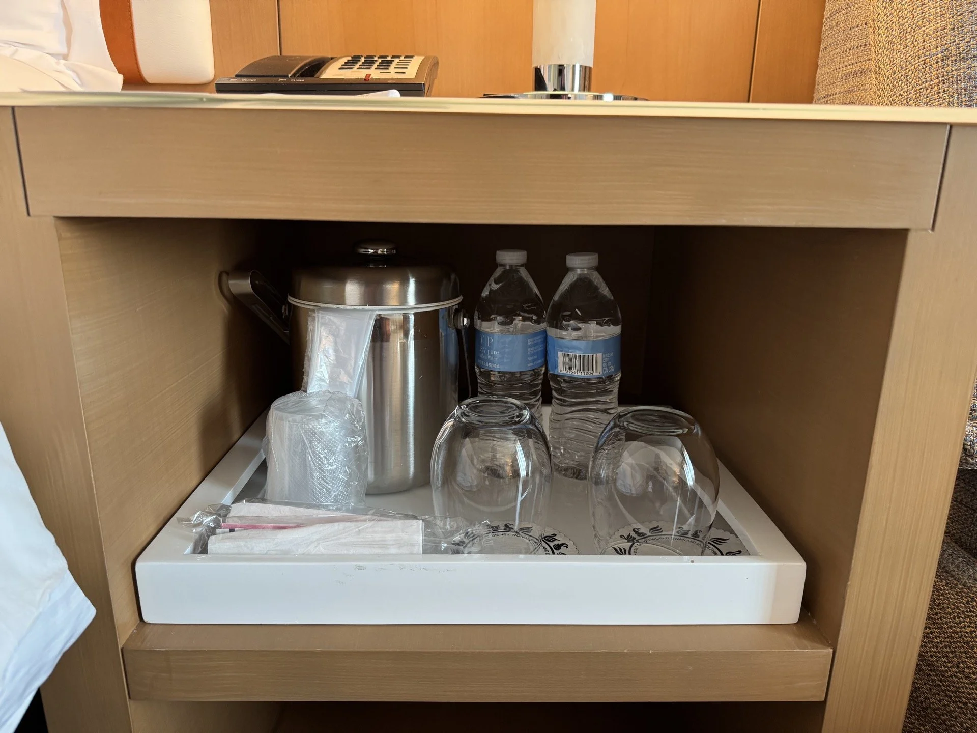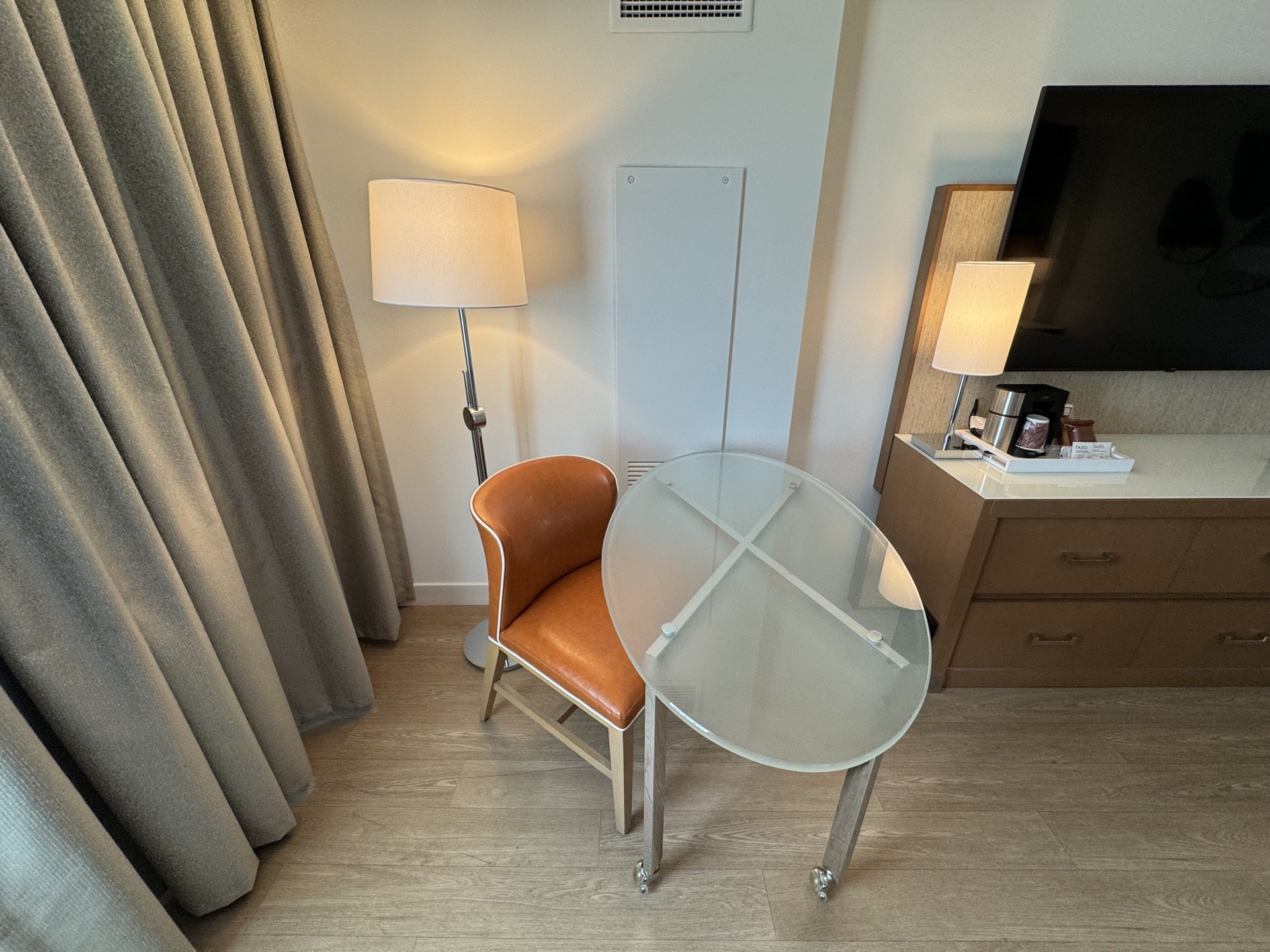 Functionally, the room earns pretty high marks. The lamps have outlets, enabling bedside charging. The console has plenty of surface space, something I learned was essential as soon as Disney started introducing gigantic consoles at their hotels. Hotels should just have Keurig machines, but I found nothing wrong with this coffee machine.