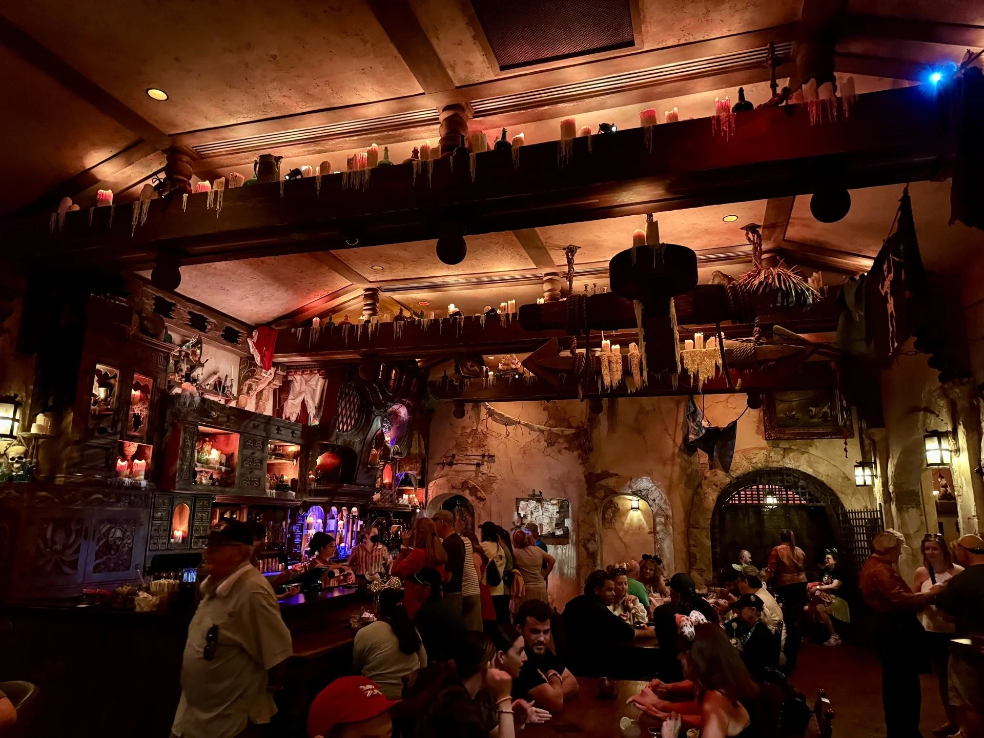 The first thing to know is that Magic Kingdom has exactly one bar. The Beak and Barrel is a pirate-themed tavern next to the Pirates of the Caribbean attraction. Alcohol you purchase inside will need to be consumed inside. Advance reservations are recommended and will probably be necessary for some time.